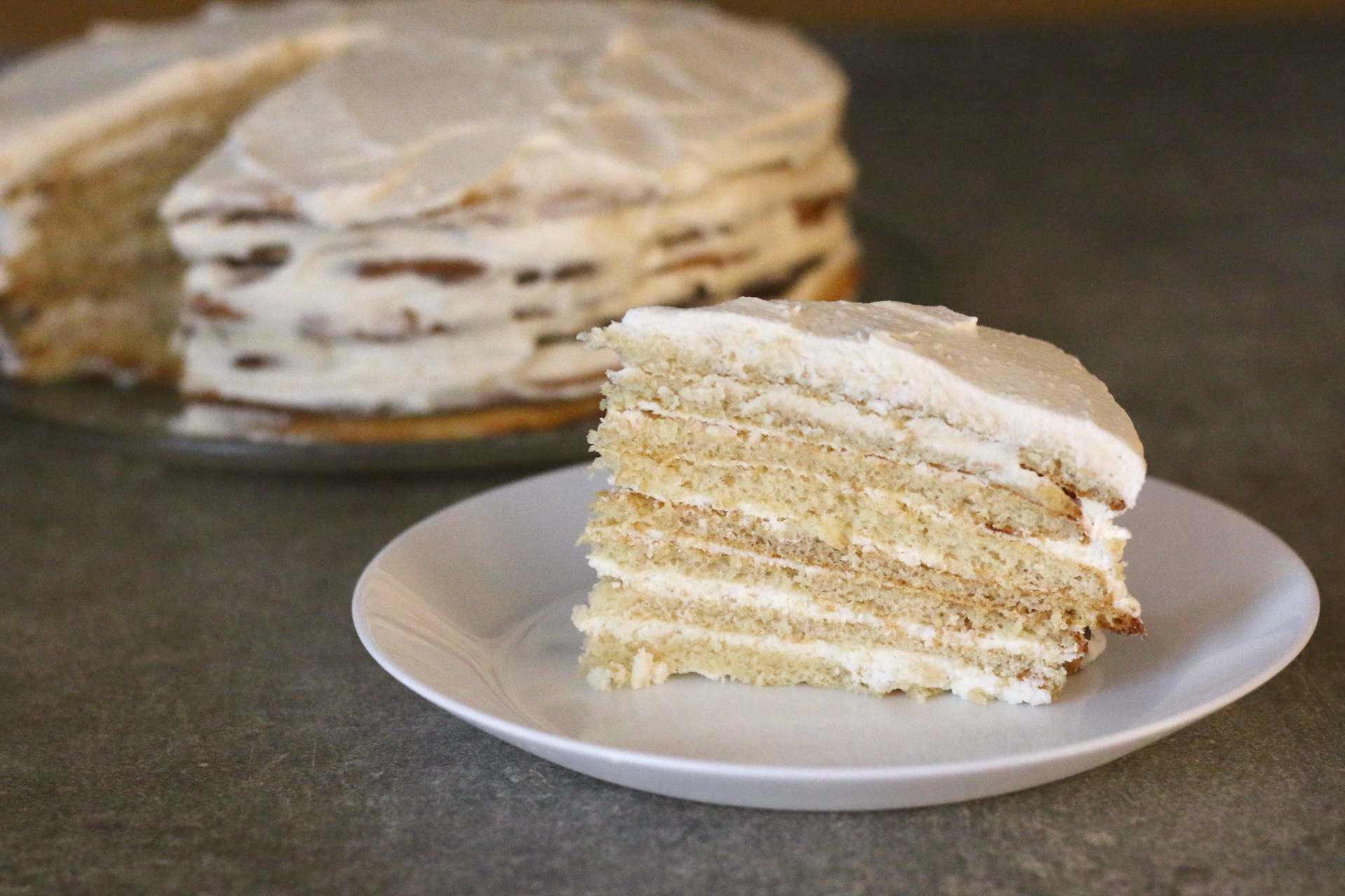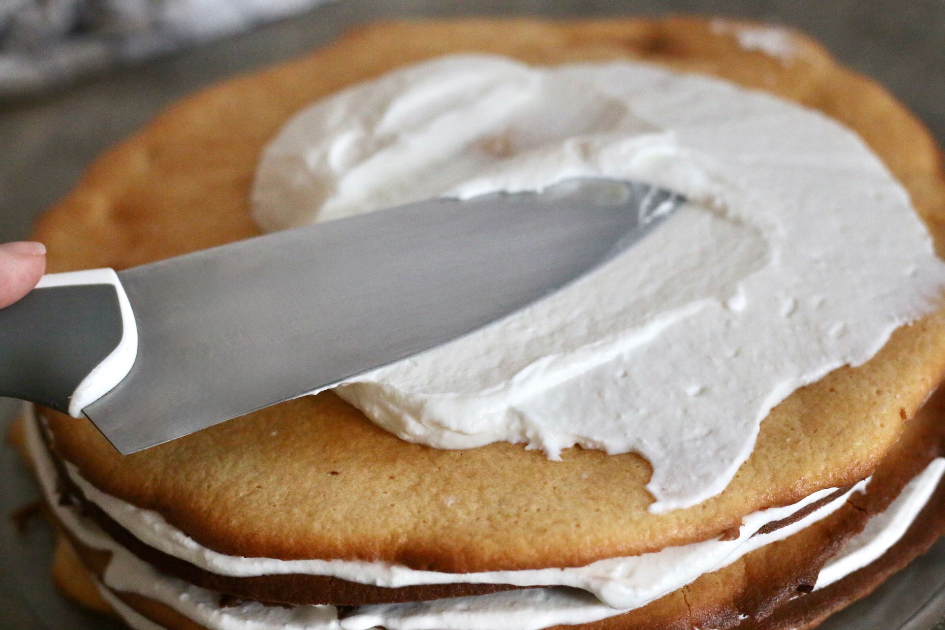 Кстати, о подаче. Для более эффектного и аккуратного внешнего вида можно обрезать коржи по краю после выпечки — так они будут ровнее. А после сборки украсить торт кондитерской посыпкой, ломтиками фруктов, ягодами, веточками мяты, конфетами и печеньем. Но лично мне в домашней выпечке нравится простой дизайн. Поэтому я просто смазала верх кремом и добавила фактуру столовой ложкой.