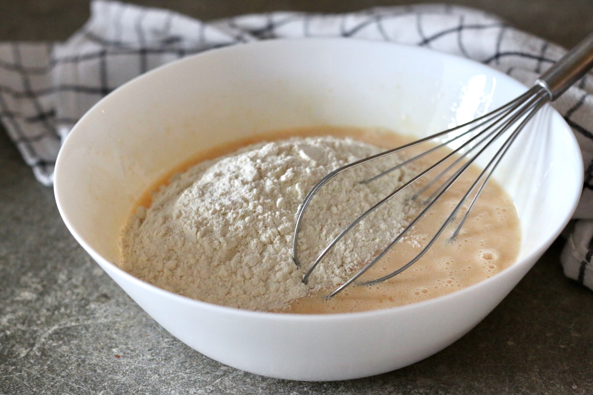 3. В отдельной миске соедините муку, ванильный сахар, соль, разрыхлитель или соду. Всыпьте сухие ингредиенты в жидкие.