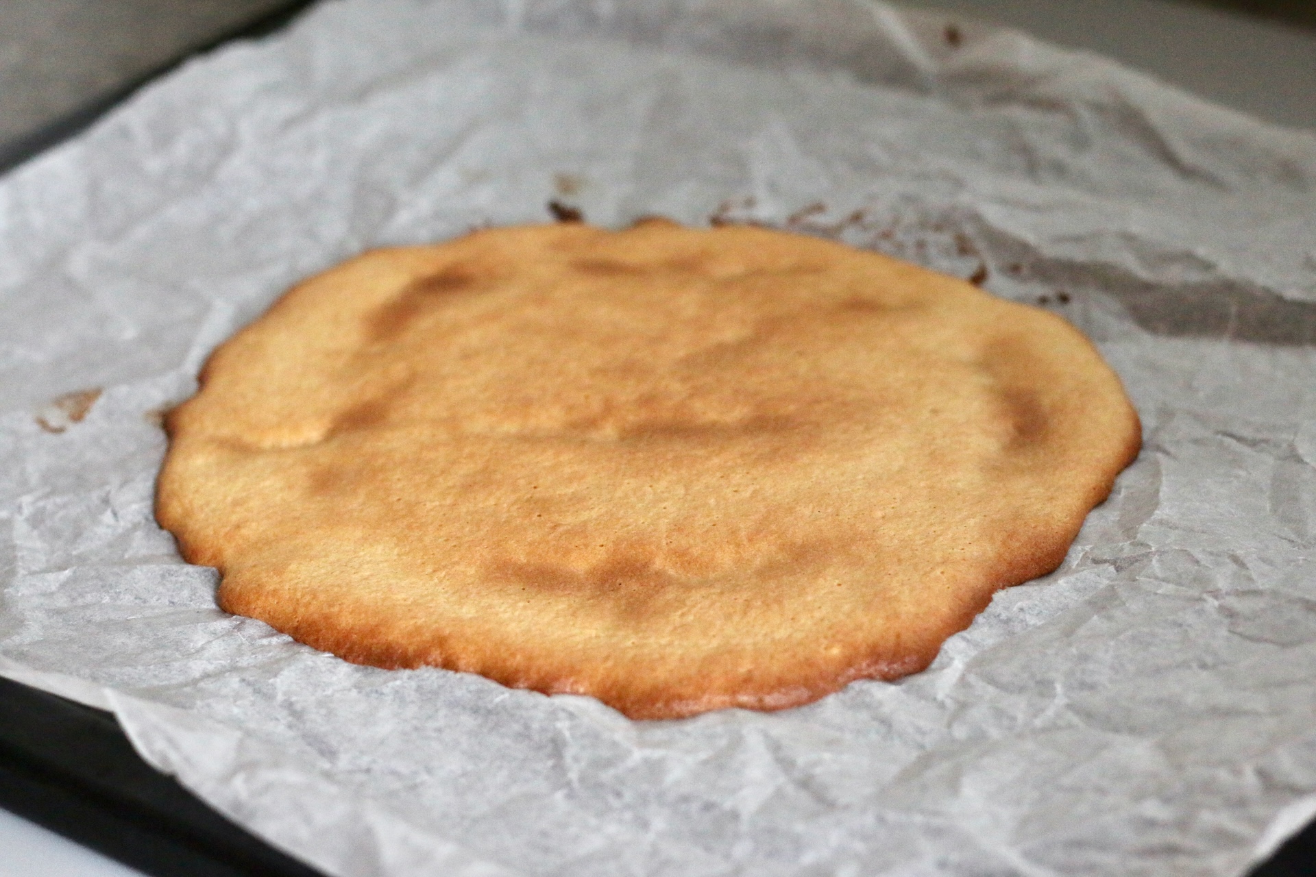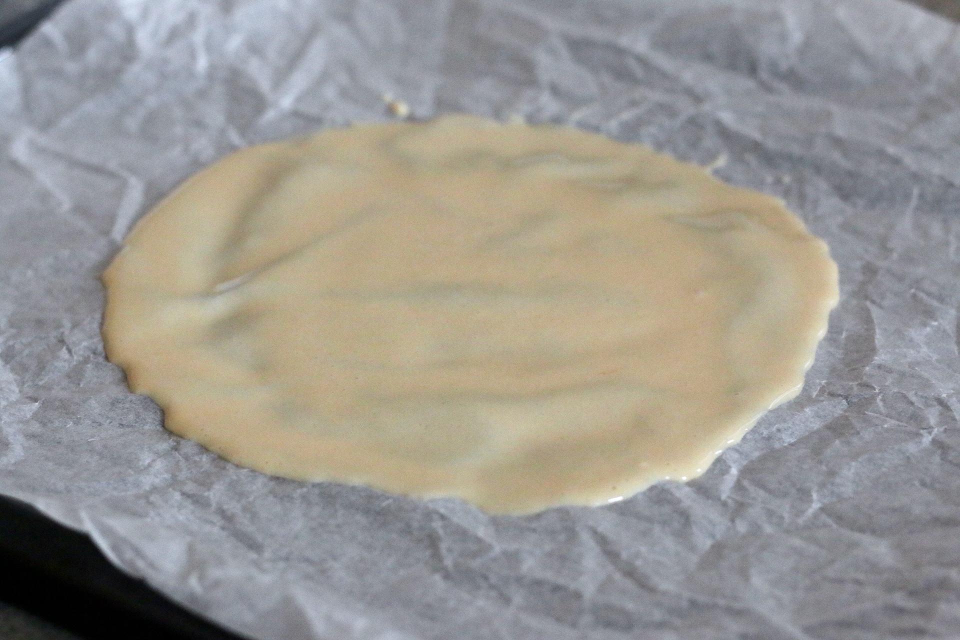 6. Противень застелите пекарской бумагой или силиконовым ковриком. Выложите 3 столовые ложки теста и распределите его тонким слоем. Должен получиться круг диаметром около 20 см. Для удобства можете предварительно наметить фигуру на бумаге карандашом, но это необязательно.