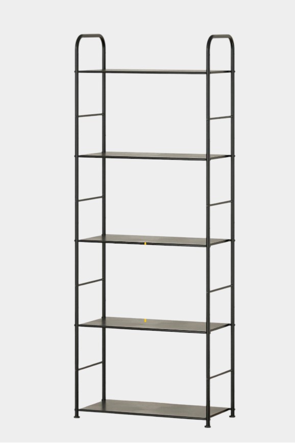 Подходит для кухни, ванной, гардероба и других помещений — из-за чёрного цвета его легко вписать в любой интерьер. Но особенно хорошо он смотрится, если вам нравится минимализм. Полки открытые, поэтому вещи, которые на нём хранятся, всегда под рукой. На него можно ставить книги, статуэтки, цветочные горшки. Стеллаж прочный — каждая полка выдерживает до 10 кг, а в комплекте есть всё для сборки.