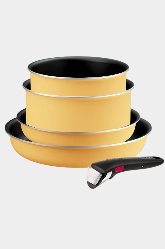 Когда хочется, чтобы дофаминовое настроение заполняло весь дом, в том числе и кухню. На выбор в линейке два цвета — лимонный жёлтый и ярко-малиновый. В комплекте пять предметов: две сковороды, столько же кастрюль и съёмная ручка.