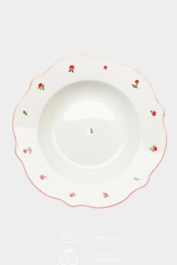 С такими тарелками кухня превращается в поместье герцогини. Набор из двух фарфоровых суповых тарелок диаметром 22 см и объёмом 320 мл подходит для супов, пасты и горячих блюд. Нежный цветочный рисунок и аккуратные волнистые края делают подачу более красивой. Тарелки лёгкие, удобные и подходят как для повседневного использования, так и для праздничного стола. Их можно мыть в посудомоечной машине и использовать в микроволновке.