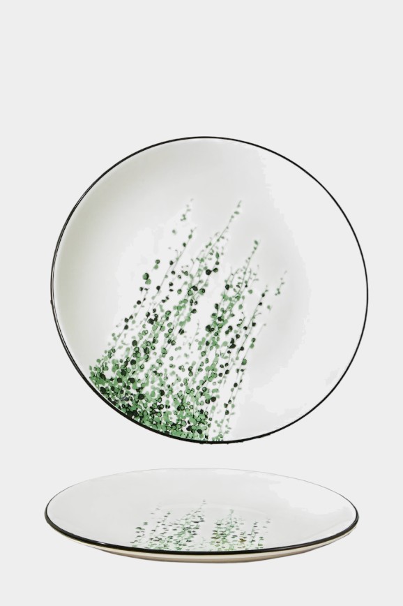 Набор из четырёх тарелок с растительным узором подходит для тех, кому не хватает зелени в душном городе. Они сделаны из прочного фарфора, который не впитывает запахи и легко очищается. Тарелки удобны в уходе: их можно мыть в посудомоечной машине и использовать в микроволновке. Универсальный дизайн подходит для дома, дачи и даже ресторана.