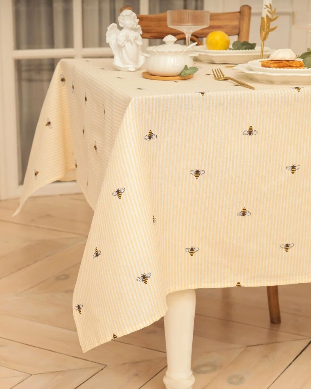 Нежные жёлто-белые полоски и маленькие пчёлки так и намекают на приближающееся лето. Рисунок выглядит ненавязчиво, при этом добавляет уюта интерьеру. Скатерть полностью из хлопка, так что не скользит и не теряет вид после частых стирок — можно стелить каждый день, а не беречь для праздника.