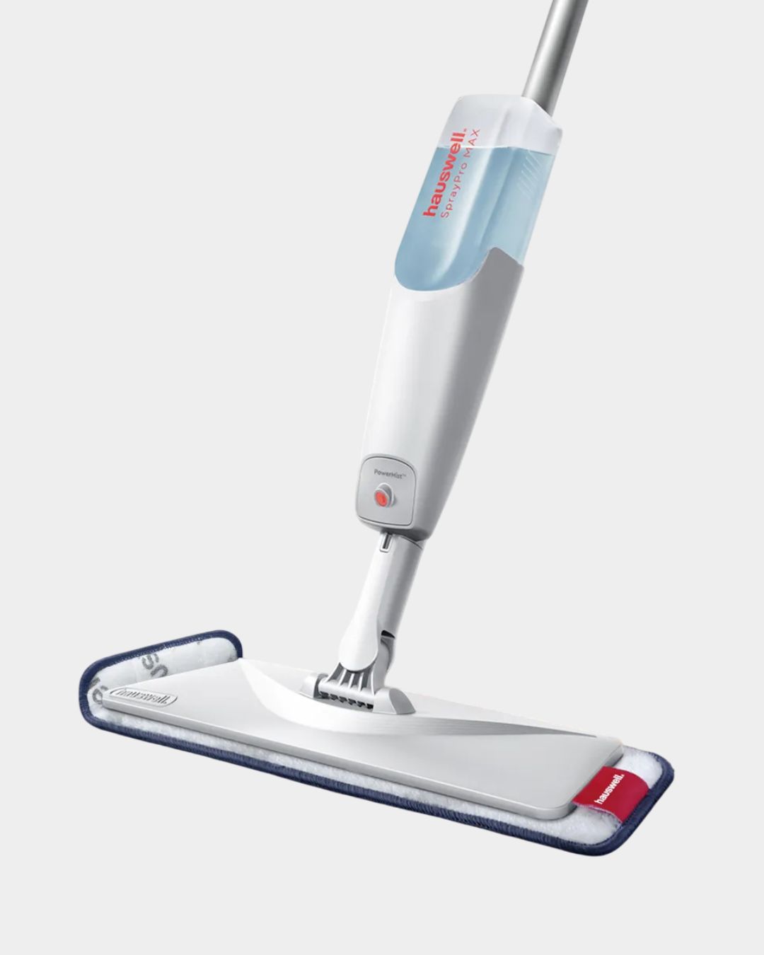 С ней не нужно таскать за собой ведро по всей квартире. В ручке спрятан резервуар на 450 мл: достаточно нажать на кнопку, и вода распыляется тонким слоем перед насадкой. При этом пол не заливает, разводов не остаётся, поэтому швабра подходит для ламината и паркета.