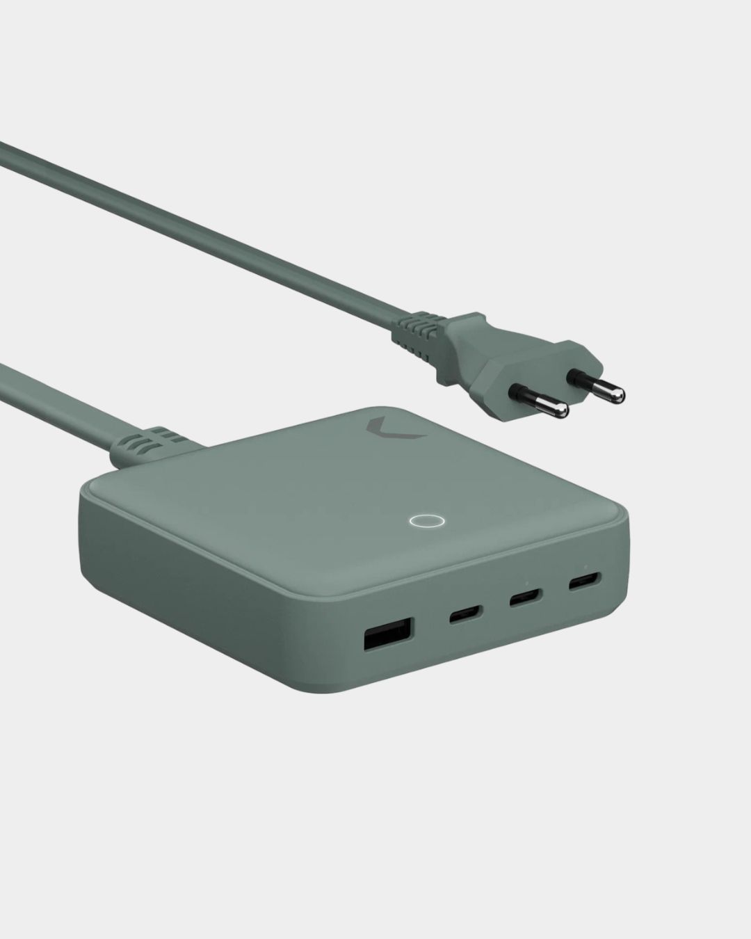 Подпитывает сразу четыре устройства — для этого есть три порта USB‑C и один USB‑A. Мощности 100 Вт хватает, чтобы смартфон набрал около 50% за полчаса, а ноутбук спокойно получал энергию без отдельного блока. Сама станция компактная, не занимает много места на столе, а благодаря спокойному серо-зелёному цвету ещё и смотрится аккуратно.