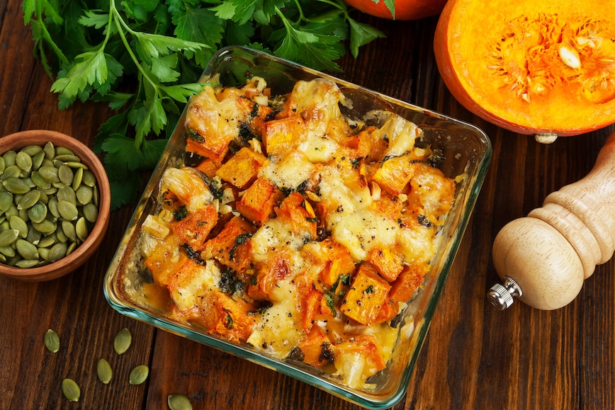 Это простое и быстрое в исполнении блюдо с тыквой: все ингредиенты смешиваются и отправляются в духовку примерно на 40 минут. И всё — вкусный и полезный ужин готов.