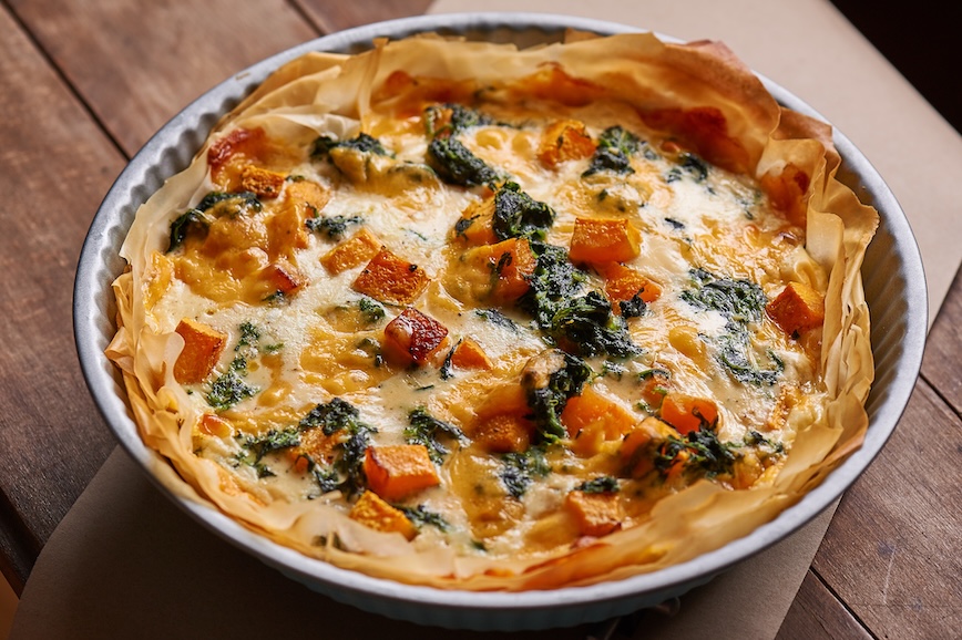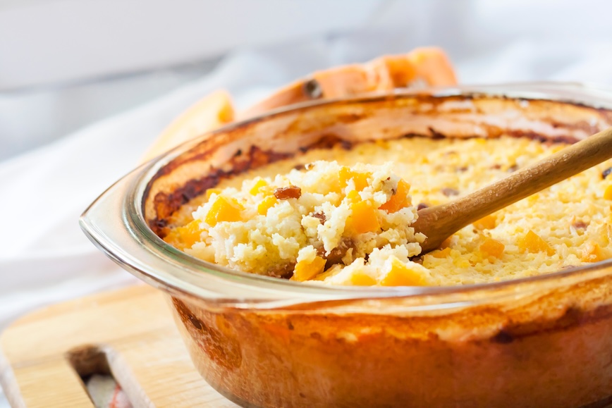 - Смешать тыкву и обжаренный с луком бекон. Добавить специи. Выложить в форму для выпечки и готовить при температуре 180 градусов 30–40 минут.