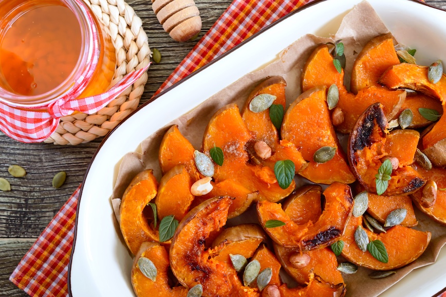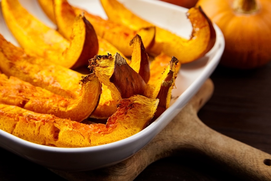 - Убрать фольгу и запекать ещё 10–15 минут, чтобы ломтики тыквы подрумянились.