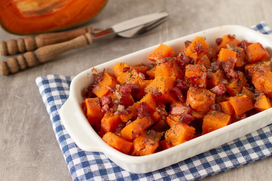 В этом сытном блюде удачно сочетается сладковатый вкус тыквы, пикантный бекон и яркий аромат тимьяна. На второй день запечённый овощ становится только вкуснее, потому что пропитывается ароматами специй.