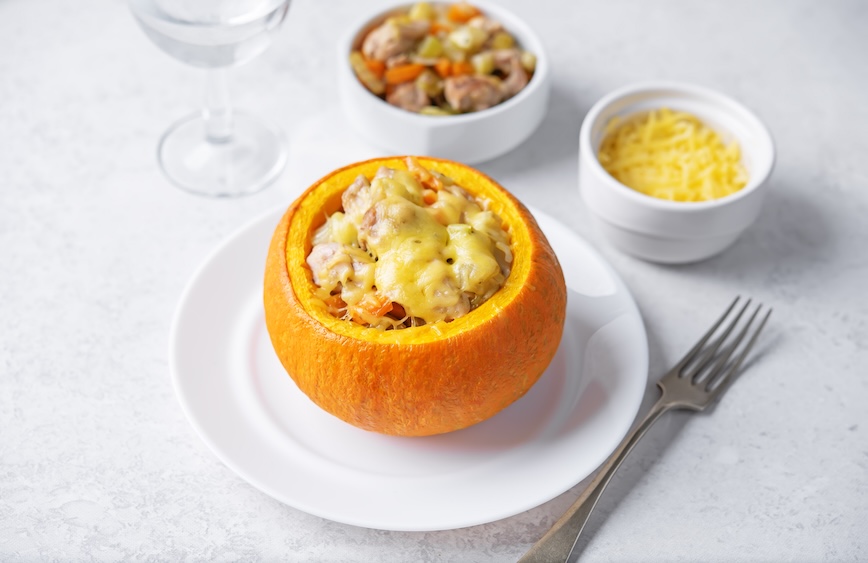 Фишка этого блюда в необычной подаче. Для него понадобятся маленькие круглые тыквы, которые будут играть роль форм для запекания.