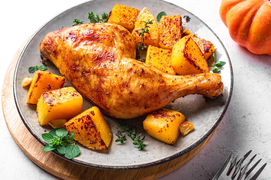- Смешать масло, соль и молотый перец. Обмазать этой смесью окорочка и овощные ломтики. Выложить в форму и запекать при температуре 200 градусов 40–50 минут. В середине приготовления перевернуть кусочки тыквы и курицы, чтобы они подрумянились с двух сторон.