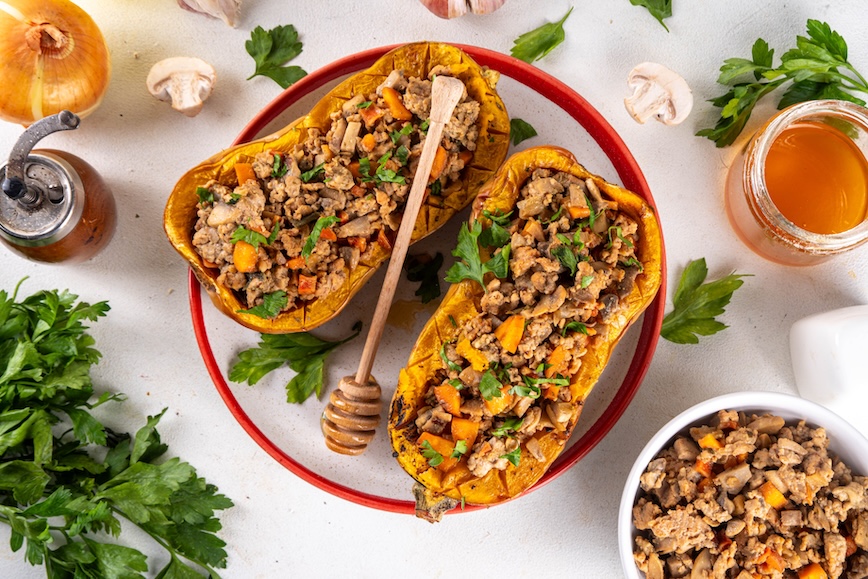 - Когда тыква станет мягкой, достать её из духовки. Примять мякоть вилкой и наполнить половинки овоща мясной начинкой. Затем вернуть в духовку и запекать ещё 10 минут. Перед подачей посыпать рубленой петрушкой.