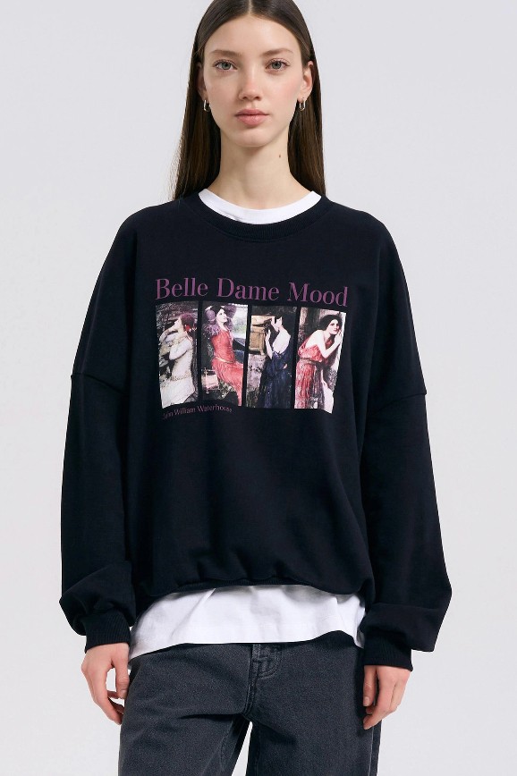 Объёмный, но лёгкий свитшот из стопроцентного хлопка. Дизайн навеян работами английского художника Джона Уильяма Уотерхауса. Как и гласит надпись, носим его, когда настроение быть безжалостной (но утеплённой!) красавицей.