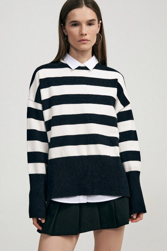 Оверсайз-модель в утончённом французском стиле — не хватает только красного берета и помады в тон. Но и с обычными джинсами и кроссовками он также смотрится стильно. А акрил в составе делает его пушистым, мягким и тёплым.