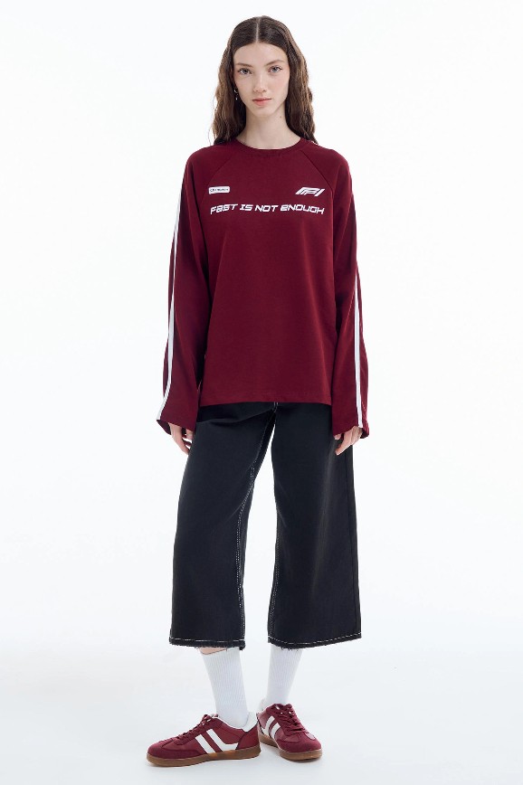Когда хочется почувствовать себя героиней американских комедий нулевых. Дизайн у лонгслива в спортивном стиле: яркий бордовый цвет, жизнеутверждающая надпись, а по рукавам — белые лампасы. Из плюсов также натуральный состав: стопроцентный хлопок, благодаря которому изделие дышит.