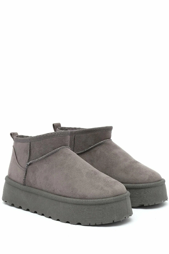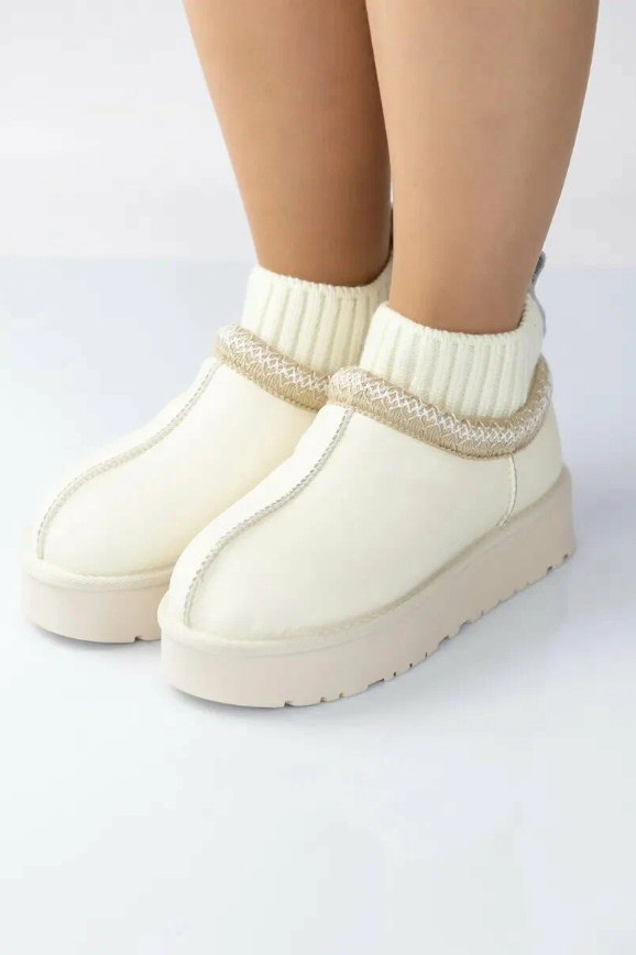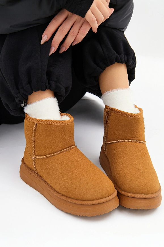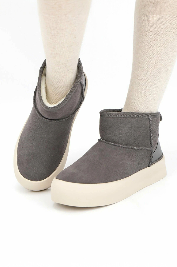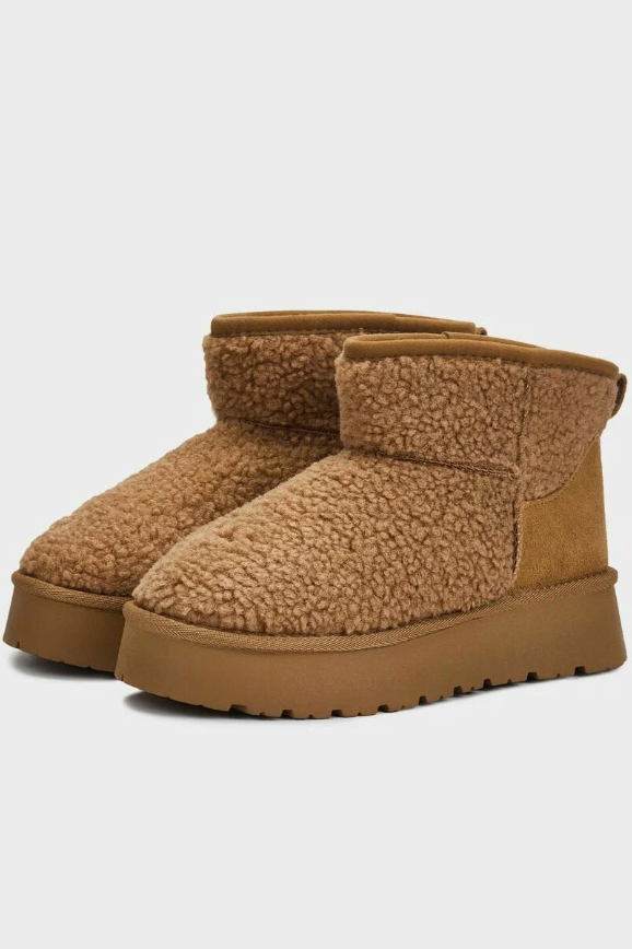 Укороченные с мягким пушистым мехом вокруг щиколотки, они похожи на стильные домашние тапочки. По крайней мере, в них также тепло и удобно. Только будьте внимательны при выборе: модель идёт размер в размер. Если возьмёте больше, то могут спадать при ходьбе. Они особенно хорошо смотрятся в сочетании с джинсами и курткой в цвет.
