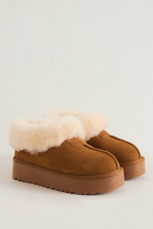 Как те самые, которые были популярны в начале десятых: классическая форма, коричневый цвет, достаточно тонкая нескользящая подошва. Эта модель сделана из искусственной замши и искусственного меха. И, несмотря на явный оттенок ностальгии, выглядит она очень современно.