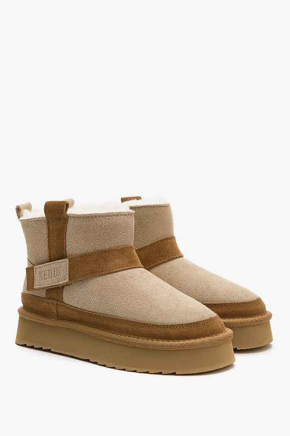 А это уже более современный вариант — так сказать, новое (удачное!) прочтение классики. Они сделаны из бежевой натуральной замши с подкладкой и стелькой из шерсти. Это обеспечивает тепло и комфорт даже в самые холодные дни. Лёгкая подошва с хорошим сцеплением делает угги удобными для повседневных прогулок, а контрастный ремешок с логотипом добавляет стильный акцент.