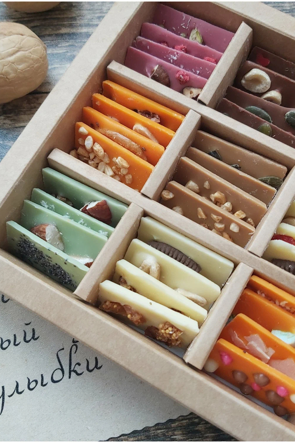 Шоколад, сделанный в форме небольших квадратных плиток, с орехами и сублимированными фруктами. Всего девять разных вкусов — по четыре штучки каждого. Подходит и для романтического вечера, и просто к чаю.