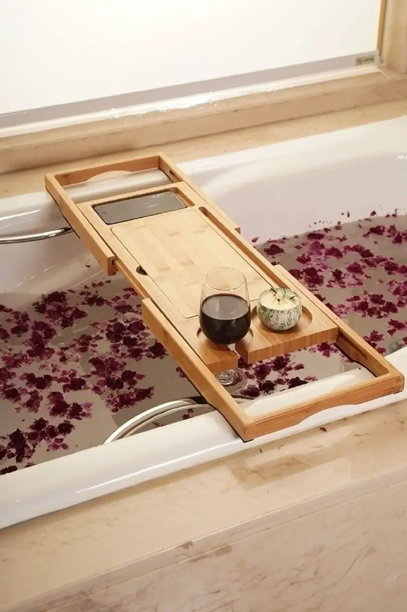 Вещица, которая устанавливается на бортики ванны и держится с помощью регулируемой ширины. На неё можно поставить книгу или планшет, бокал, свечи или небольшие тарелки с закусками. Принимать ванну станет приятнее вдвойне.