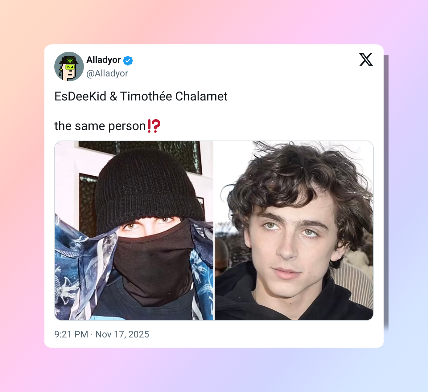Сторонники теории о том, что Шаламе и EsDeeKid — это один человек, заметили, что в последнее время Тимоти прячет своё лицо, открывая лишь глаза. Ещё у обоих одинаковые банданы, и актёр также умеет читать рэп. А тиктокерша KJ.Freeman , что в имени Timothée две буквы «e» подряд, так же как и в EsDeeKid. Других аргументов у пользователей сети пока нет. Но ни рэпер, ни актёр не опровергли эти домыслы, несмотря на то что посты об их сходстве завирусились.