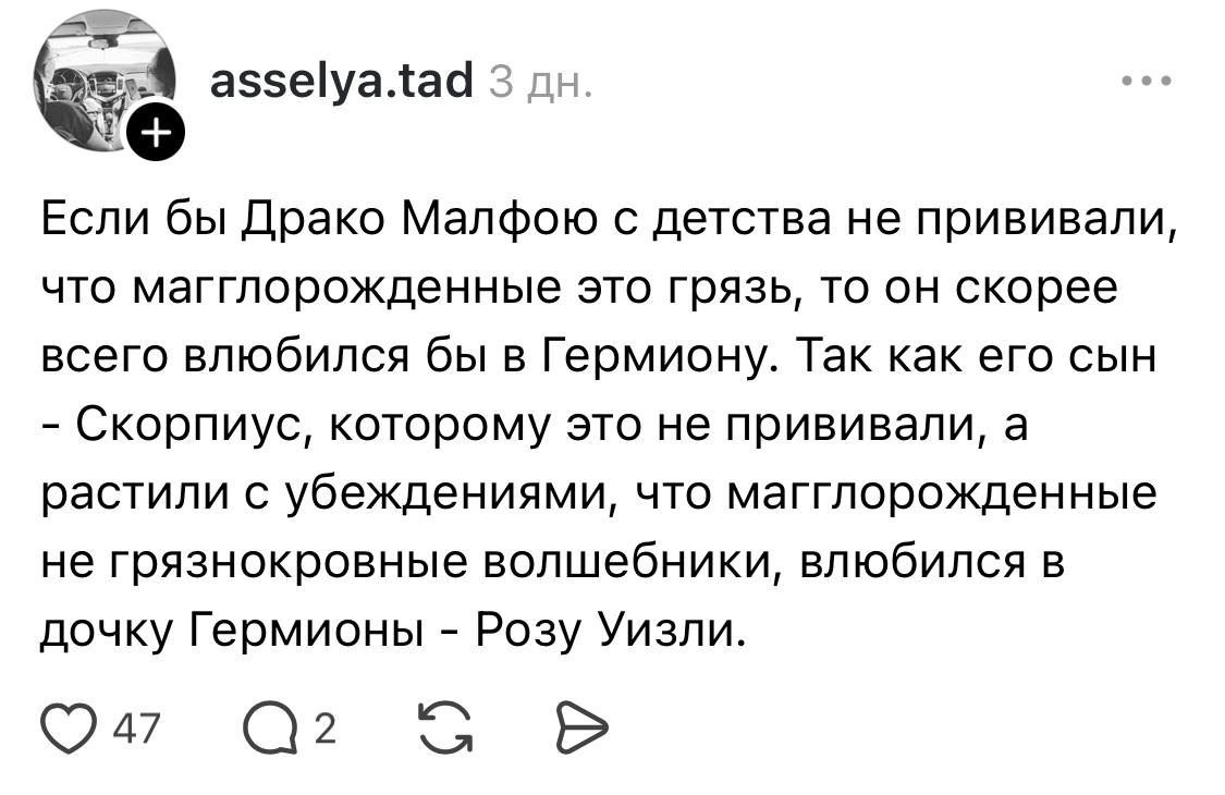 Кто-то отреагировал на призыв с юмором, а кто-то рассказал теории, которые вполне могли бы оказаться рабочей историей. Например, поклонникам «Гарри Поттера» давно не дают покоя отношения Гермионы Грейнджер и Драко Малфоя.