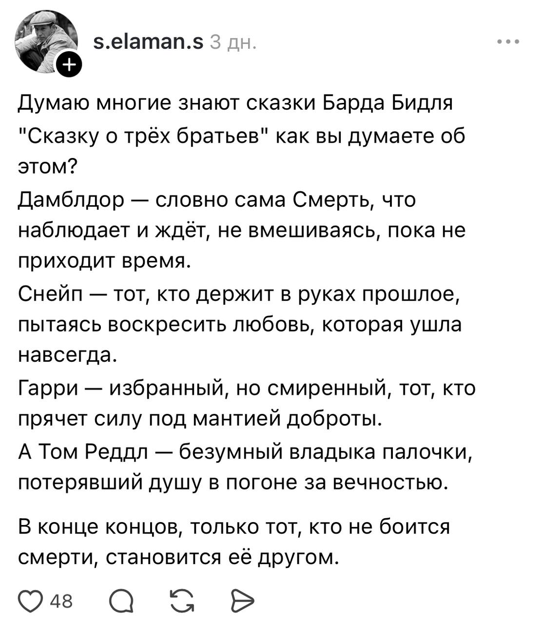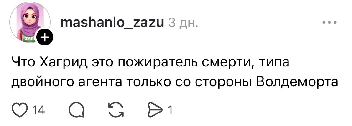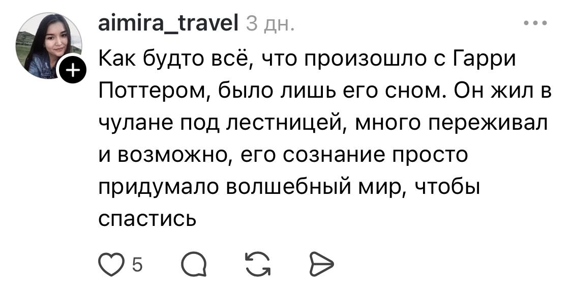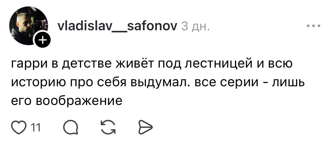 В Threads появился небольшой тред, посвящённый «Гарри Поттеру». На волне новостей о будущем сериале про юного волшебника пользователь под ником ne_prosto_orchestra задумался о том, какие безумные теории существуют вокруг этой истории. Поделиться ими он попросил поттероманов.
