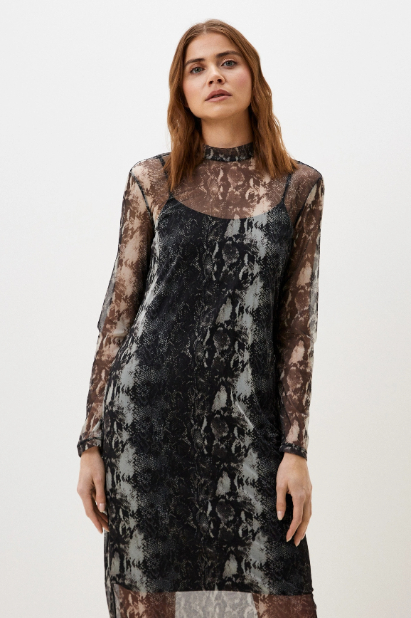 Для ярких и дерзких! А ещё для тех, кто традиционным застольям и походам в ресторан предпочитает шумные вечеринки с кучей танцев. Это платье выглядит броско из-за полупрозрачной ткани и приятного фиолетового цвета. При этом верх полностью закрытый, с длинными рукавами, а в меру короткая юбка открывает вид на ноги. Изделие хорошо сочетается как с элегантными туфлями на каблуке, так и с тяжёлыми ботинками.