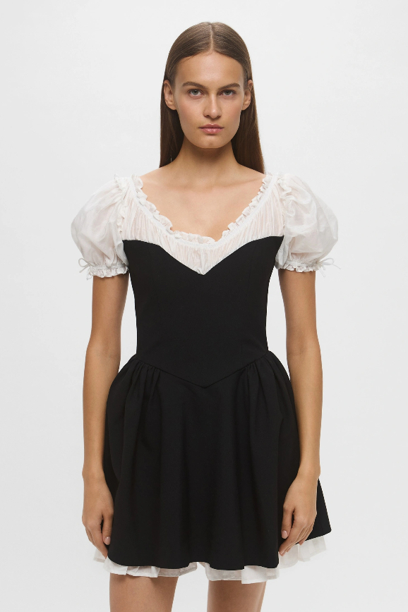 Это чтобы оставить бедную жизнь и бессмысленный труд в старом году, а в новом только и делать, что притягивать богатства. Платье выполнено из ткани двух контрастных цветов. Оно делает акцент на талию, имеет мини-длину, чётко оформленный лиф и пышную юбку со скрытыми воланами в области бёдер, которые придают дополнительный объём. Рукава украшены оборками и завязками в виде бантов.
