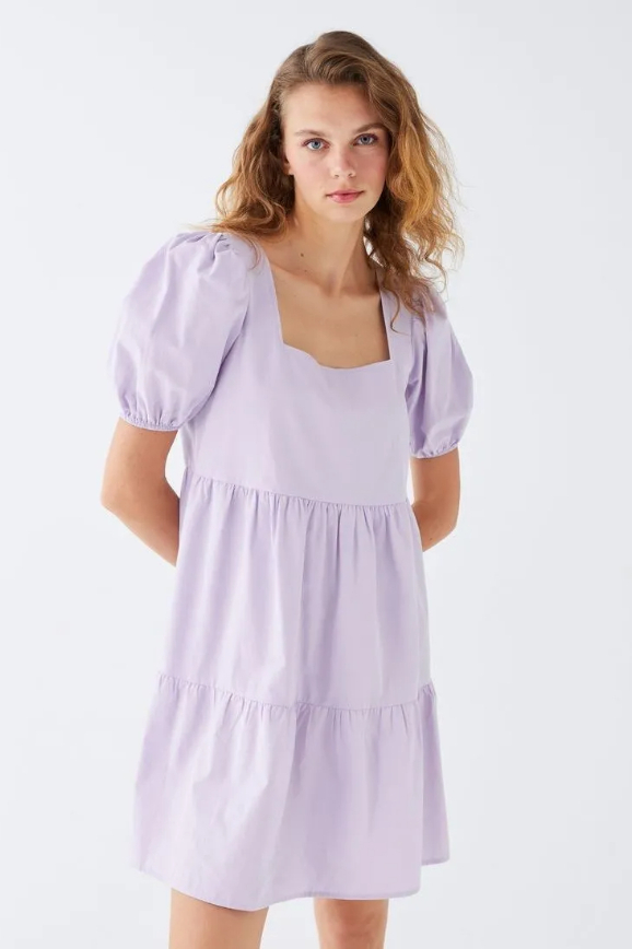 В нём вы станете похожей на лёгкое воздушное пирожное — представляем, как красиво будет развеваться юбка, когда вы начнёте кружиться в танце. Нежно-лиловый цвет, рукава фонарики и свободный крой, — в таком наряде нужно не Новый год праздновать, а спешить на бал к Бенедикту Бриджертону.