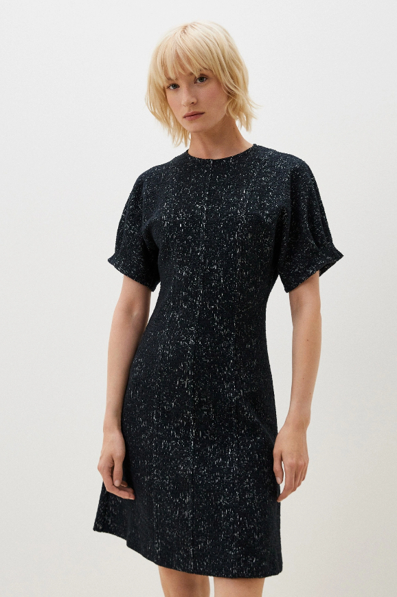 На Новый год блёсток много не бывает, а что это — пыльца фей или слёзы Снежной Королевы, выбирайте сами. У платья полукруглый вырез и закрытая спина. Силуэт простой — сидит по фигуре. Юбка чуть выше колен, и рукава длиной как у обычной футболки. Но выглядит оно всё равно нарядно из-за белых крапинок, напоминающих блёстки.