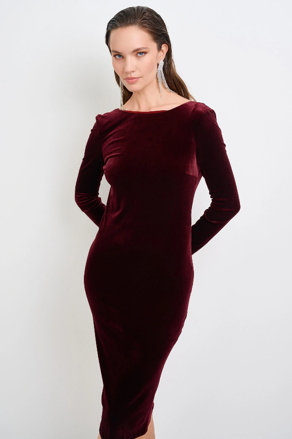 Есть тихая роскошь, а это платье вписывается в концепт громкой — на Новый год можно себе позволить. Внимание привлекает благородный винно-бордовый цвет и бархатная ткань. Материал мягкий и приятный, выглядит нарядно. В зоне декольте — вырез. Изделие облегает силуэт и красиво переливается при искусственном освещении, придавая образу глубину.