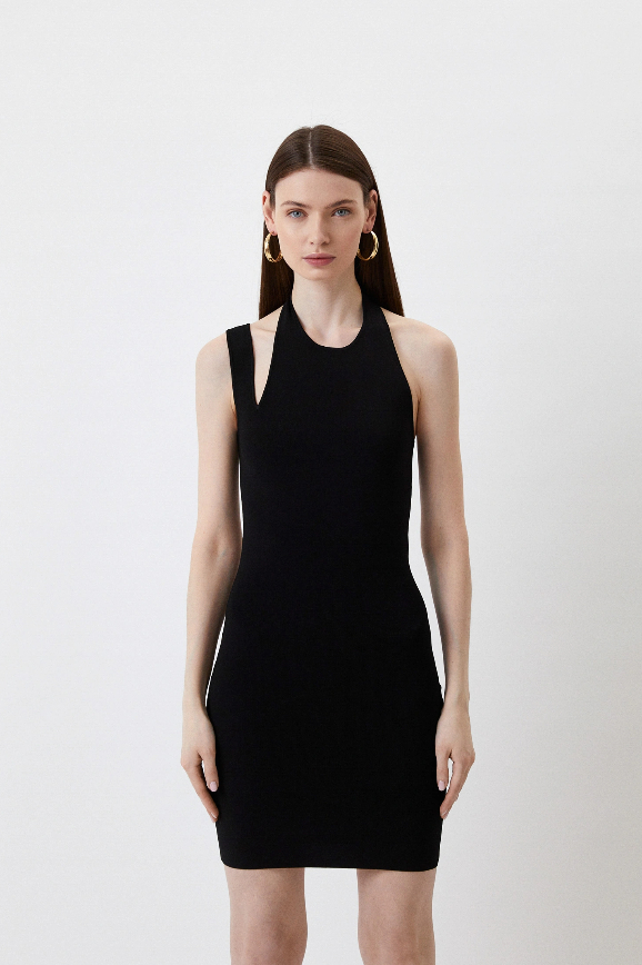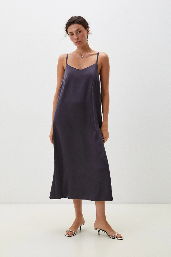 То самое маленькое чёрное платье, которое, по заветам Коко Шанель, должно быть в гардеробе у каждой девушки. У этой модели простой фасон: лямки, оптимальная длина до середины бедра и небольшой вырез на спине. Вся изюминка в лёгкой асимметрии с правой стороны, которая добавляет образу оригинальности. С правильно подобранными аксессуарами платье смотрится празднично, но не вычурно.