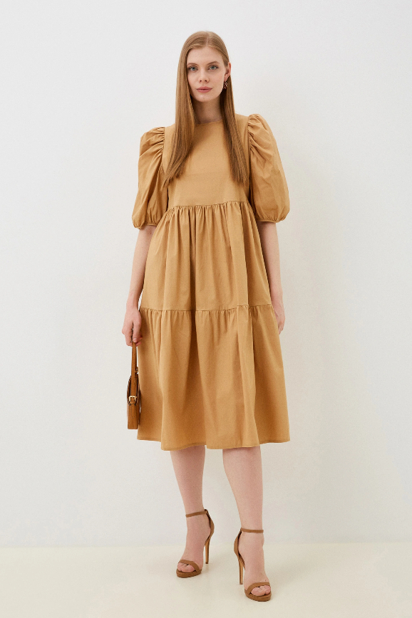 Сочетание хлопка и эластана — находка, когда вещь не мнётся, но при этом приятно соприкасается с кожей. Фасон с объёмными рукавами и юбкой от груди дарит ощущение свободы, а роскошный золотисто-коричневый цвет превращает вас в принцессу, которая приехала из тёплой страны, где много песка и солнца.