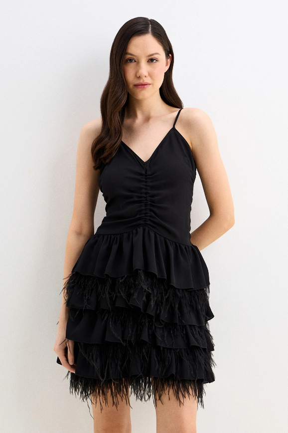 Почему бы в новогоднюю ночь не превратиться в Чёрного лебедя? Это платье по фасону напоминает балетную пачку: приталенный верх на тонких бретелях с сердцеобразным вырезом и короткая пышная многослойная юбка, словно украшенная перьями. От вас точно не смогут оторвать глаз.
