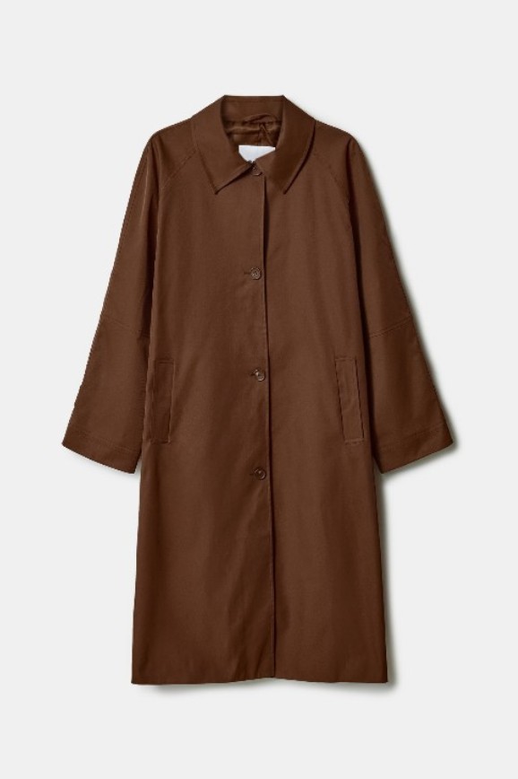 Самое привлекательное в тренчах — их длина. Обычно они идут до колен или даже ниже, что позволяет носить юбки и не бояться отморозить ноги. Эта модель максимально базовая: у неё простой крой, нейтральный цвет (здесь на выбор два варианта — коричневый или оливковый) и минималистичный дизайн без всяких наворотов.
