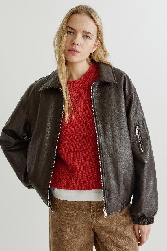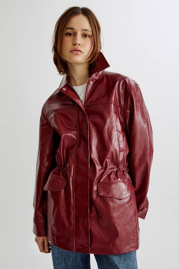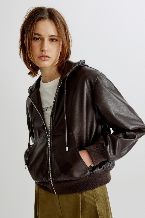 В ней хочется отправиться загадочно бродить по улицам под треки Arctic Monkeys, The Cure или Radiohead. Веет от неё духом юности и бунтарства. Может, всё дело в материале — коже, но здесь она искусственная. Или же в фасоне — сделано изделие на манер бомбера с тканевыми манжетами и трикотажной резинкой на талии. У куртки есть карманы, в которые удобно прятать руки, и капюшон, регулируемый шнурком.