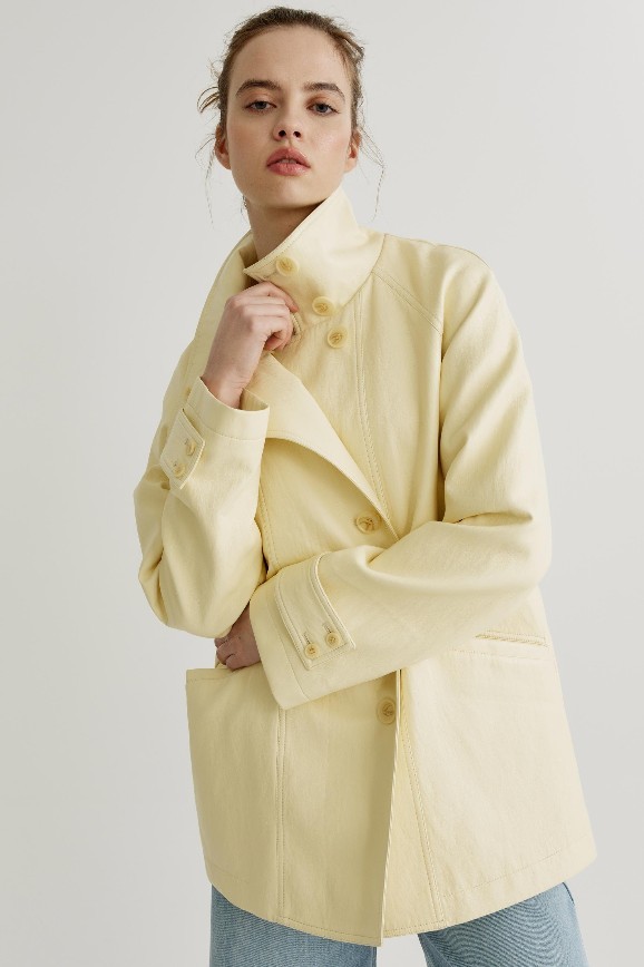 Нежно-лимонный цвет как бы намекает: неважно, какое сейчас время года, на улице уже вышло солнышко, и оно сейчас перед вами. Выполнена куртка из искусственной кожи, крой у неё свободный. Но самое главное в ней — высокий воротник. Очень хорошее решение на весну, когда погода ещё нестабильна и бывает ветрено, ведь горло лучше в таких случаях держать прикрытым.
