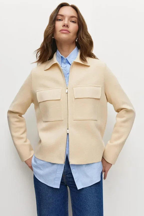 Главное преимущество этого жакета — удачное сочетание трендового дизайна и практичности. Он выполнен из плотного, но мягкого трикотажа, хорошо держит форму и приятно сидит на фигуре. Актуальный цвет сливочного масла дополняет золотистая молния, а большие нагрудные карманы привносят изюминку в минималистичный дизайн. Жакет можно надевать поверх классических рубашек, водолазок с высоким горлом, топов и боди — во всех случаях образы выглядят стильно.