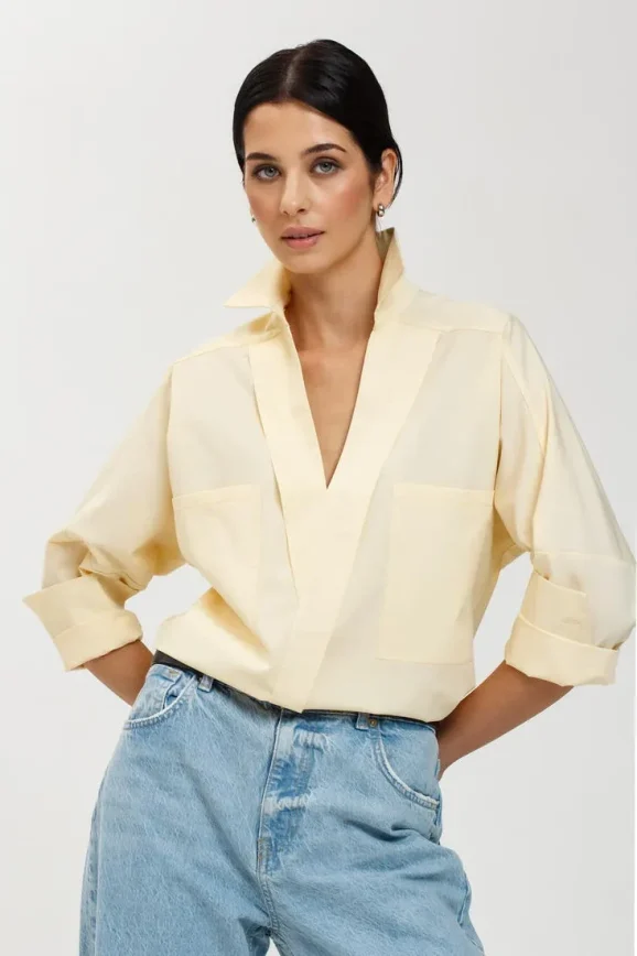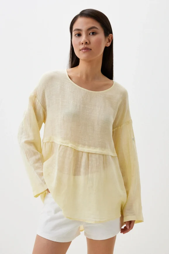 Находка для летней жары: лёгкая, дышащая и при этом стильная. Она сделана из натуральной ткани, поэтому приятно ощущается на теле и подходит для людей с чувствительной кожей. Минималистичный дизайн делает её универсальной: блузка вписывается в наряды и для офиса, и для вечернего променада, и для походов на пляж. Если вам не нравятся длинные рукава, их можно подвернуть и зафиксировать пуговицей. Покупатели отмечают, что она немного большемерит, так что лучше брать на размер меньше. Из приятного — производитель позаботился об экологичном составе, чтобы снизить загрязнение окружающей среды.