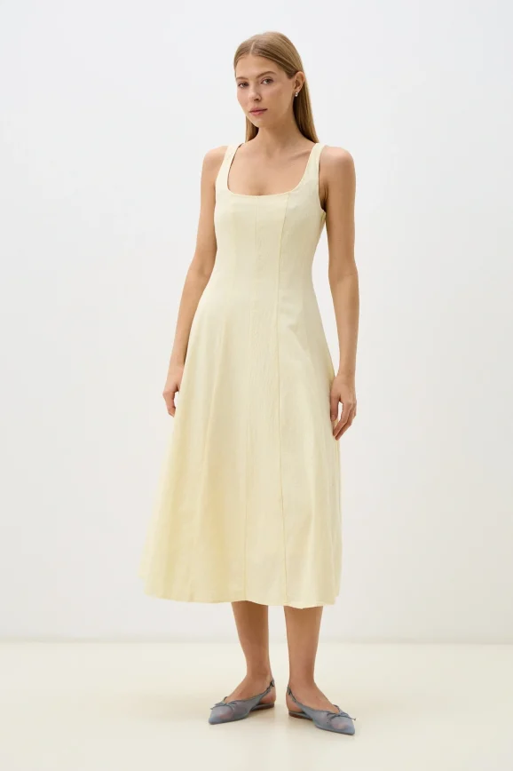 Нежный вариант с лёгкой винтажной ноткой и летним настроением, который хочется дополнить шляпкой, чтобы взять в руки корзинку и отправиться на пикник куда-нибудь в цветочные поля. Он выполнен из хлопка с лёгким жатым эффектом, что в совокупности с простым фасоном смотрится стильно и ненавязчиво. Сарафан подчёркивает фигуру, плотно облегая грудь и талию, но свободно струясь по бёдрам. Длина у него комфортная — до середины икр, поэтому можно не бояться, что юбку сдует в ветреную погоду.