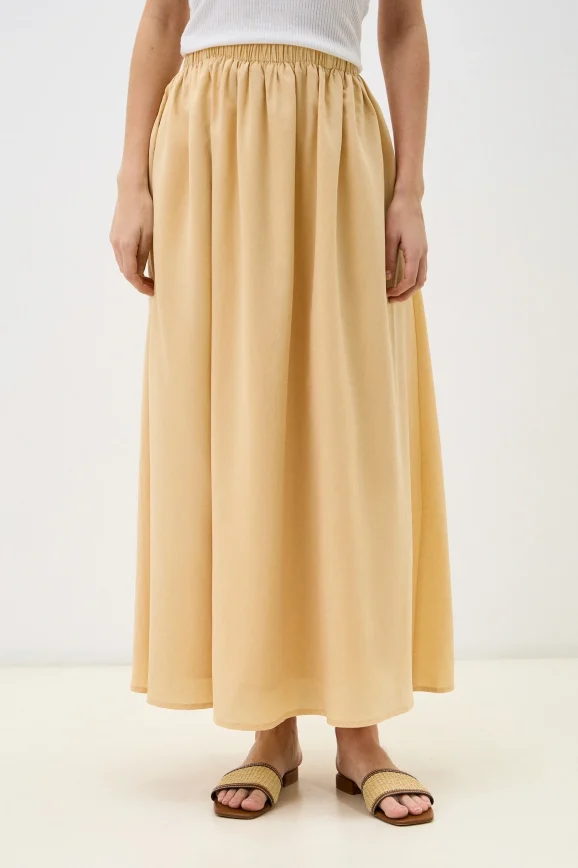 Такой вариант станет акцентом в вашем гардеробе — с виду простая, но за счёт трендового цвета она привлекает к себе внимание и удачно смотрится в сочетании с белоснежными блузками, топами и футболками. Лёгкая и воздушная, она красиво струится при движении и подчёркивает талию. А высокая посадка и длина до щиколоток создают элегантный силуэт.
