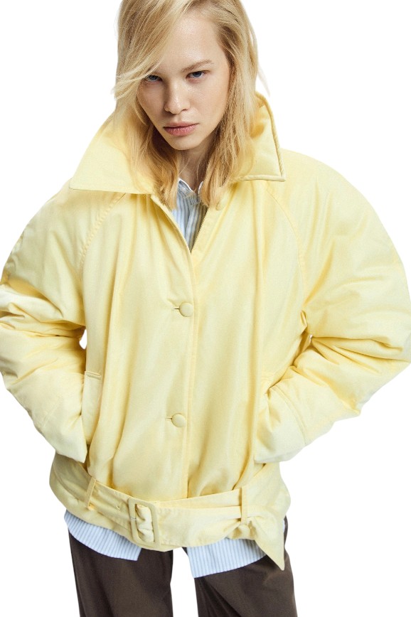 С наступлением тёплой погоды хочется добавить красок в жизнь и в гардероб. Эта курточка нежно-лимонного цвета как раз отзывается на такое желание. Выглядит лёгкой и не громоздкой, но внутри она утеплённая, поэтому в ней не холодно при низких температурах. Застёгивается на пуговицы, а в комплекте идёт пояс. И ещё у неё просто умопомрачительный отложной воротник!