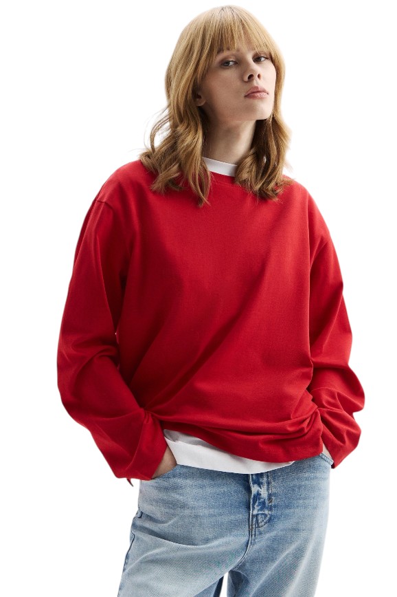 Когда хочется выглядеть стильно и аккуратно, но нет желания тратить много времени на сборку гардероба, тогда на помощь приходят базовые вещи, которые при любом раскладе смотрятся хорошо, — такие, как этот оверсайз-лонгслив из стопроцентного хлопка. В линейке два цвета на выбор — насыщенно-красный и нейтральный коричневый.