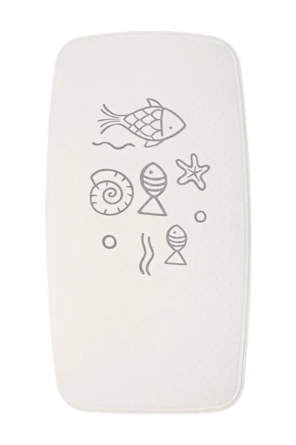 У него на обратной стороне находятся специальные крепления, которые плотно соприкасаются с полом и не скользят от влаги. А ведь это помогает избежать несчастных случаев! Коврик сделан из синтетического каучука с защитой от плесени и грибка. Он нейтрального белого цвета с милым узором в виде рыбок, морских звёздочек и ракушек.