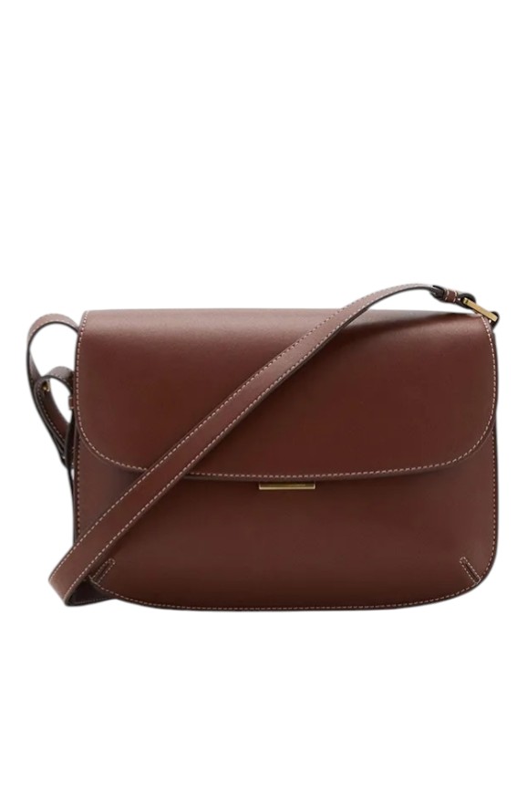 Выглядит просто, но дорого из-за минималистичного аккуратного дизайна и благородного коричневого цвета. Материал, к слову, приятный на ощупь. Внутри три отделения, центральное — самое вместительное. Застёгивается сумка на специальный замочек с кнопкой, который одновременно надёжно защищает вещи и выглядит неброско. У аксессуара есть длинный ремешок, чтобы носить через плечо.