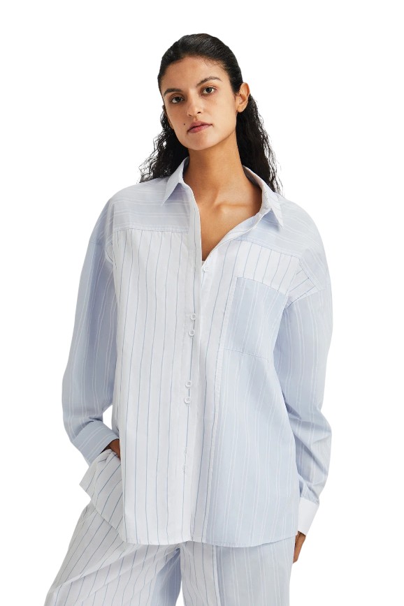 Вариант для офисных нимф — ценительниц минимализма и продуманности деталей. Вертикальные полосы визуально вытягивают силуэт, свободный крой дарит ощущение воздуха, а белая манжета только с одной стороны добавляет дерзости. Рубашка вписывается и в деловой образ с брюками, и в расслабленный выходной сет с джинсами. А ещё поговаривают, что в ней, такой лёгкой и воздушной, рабочие задачи закрываются с такой же лёгкостью.