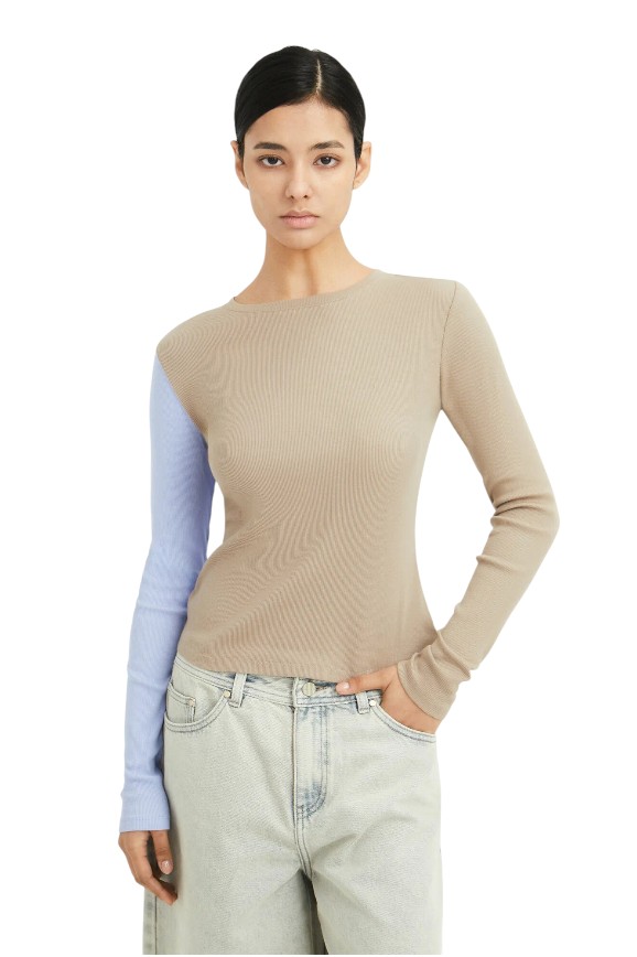 Будущее близко! Этот лонгслив играет на контрастах: тёплый беж соседствует с холодным сиреневым, словно соединяя два измерения. Но в линейке есть и более спокойные варианты — шоколадный с акцентом на кирпичный и белый с акцентом на серый. Все они смотрятся стильно и превращают повседневный образ в яркое заявление.
