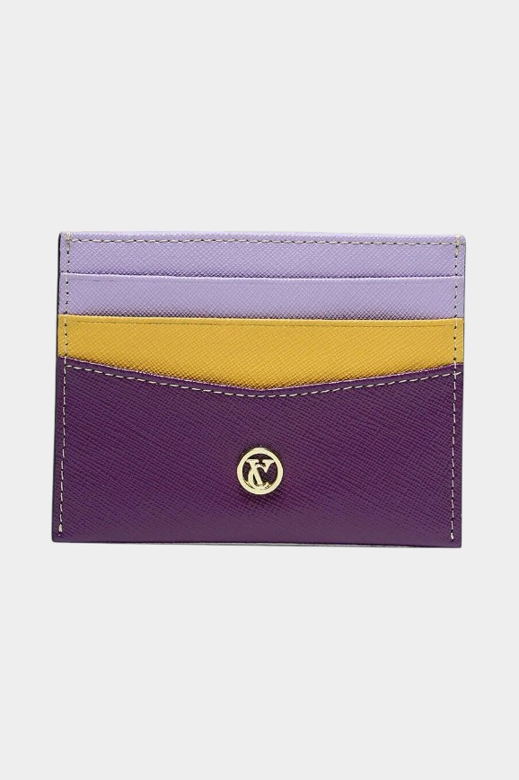 Он сделан из натуральной кожи, поэтому прослужит долго и сохранит аккуратный вид. У него шесть отделений для карт и одно — для бумажных денег. В глаза особенно бросается задорное сочетание фиолетового, жёлтого и лилового в дизайне.